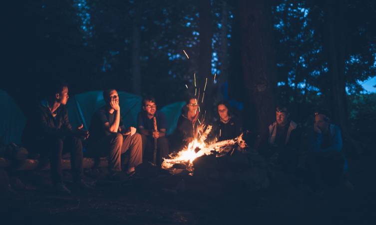 Relax around a safely managed bonfire with group activities, music, and story sharing, creating a warm and reflective experience in the peaceful mountain night environment.